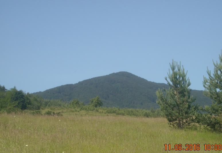След още половин час вече съм на голямата поляна, от където се вижда невисок връх, който трябва да е Мъхченица, целта на днешното ми пътешествие.