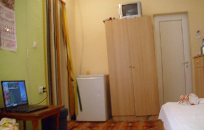 Тук си струва да сложа снимки от вътрешното обзавеждане. В ляво е входната врата, а насреща - входът за банята. В долапа имаше няколко чинии, ножове, вилици и лъжици.