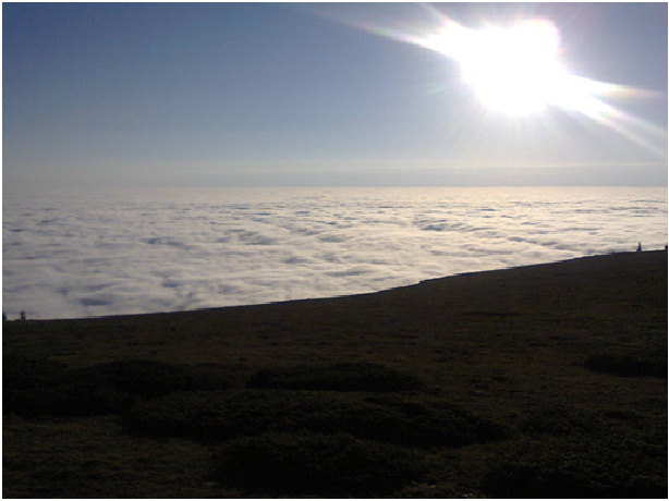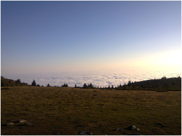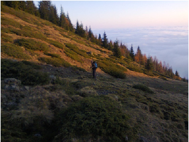 На другия ден за мое щастие имаше такава мъгла, даже лек дъждец, че не посмяхме да си подадем носа навън. Хапнахме по бобена чорба и продължихме да си лежим горе в стаята. Някъде към 14.00 почна да ни доскучава и решихме мъгла не мъгла да опитаме по маркираната пътека да излезем някъде на високото. А по прогноза трябваше в планините да е ясно и слънчево. Тръгнахме по лятната маркировка и няма и след час излязохме от мъглата.