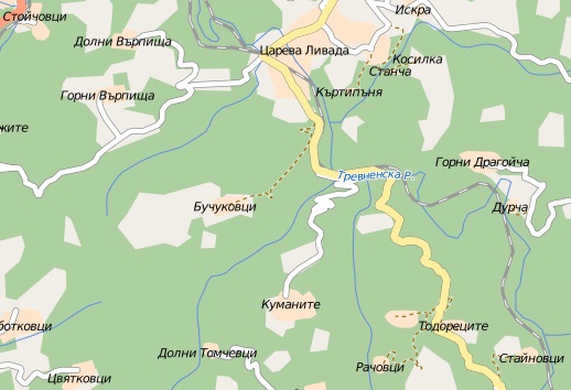 За село Бучуковци се тръгва от същия ЖП прелез, но с посока град Трявна. Върви се през село Царева ливада, минава се покрай портал на военно поделение или на завод с охрана и след километър в дясно се отделя пътят за Бучуковци. Разстоянието от гарата до селото е три километра, но понеже има пешеходна пътека, която подсича един голям завой, то за около час се стига спокойно от гарата до селото. В началото му пътят се разклонява. Което и отклонение да хване, лявото или дясното, обикаля се цялото село и пак се излиза на същото място. Вижда се и на спътниковата снимка. Много приятен маршрут също за полудневен лек преход.