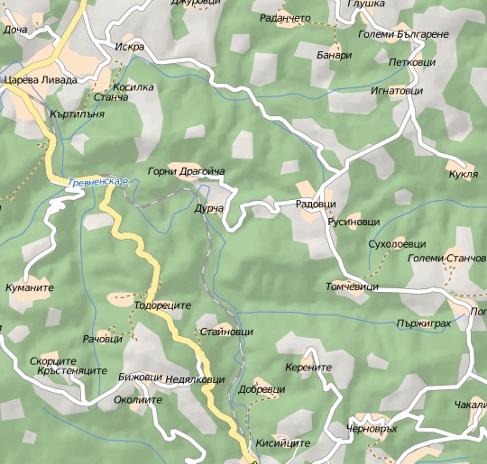 След точно два часа ходене от центъра на Царева ливада се излиза на разклон. В дясно е пътят за Радовци и има табела с надпис Трявна, а в ляво няма означения. Това е пътят за Дряново. Минава се през село Големи Българени и няколко околни махалички. Ако се тръгне в дясно след няколко минути се вижда табелата на Радовци.